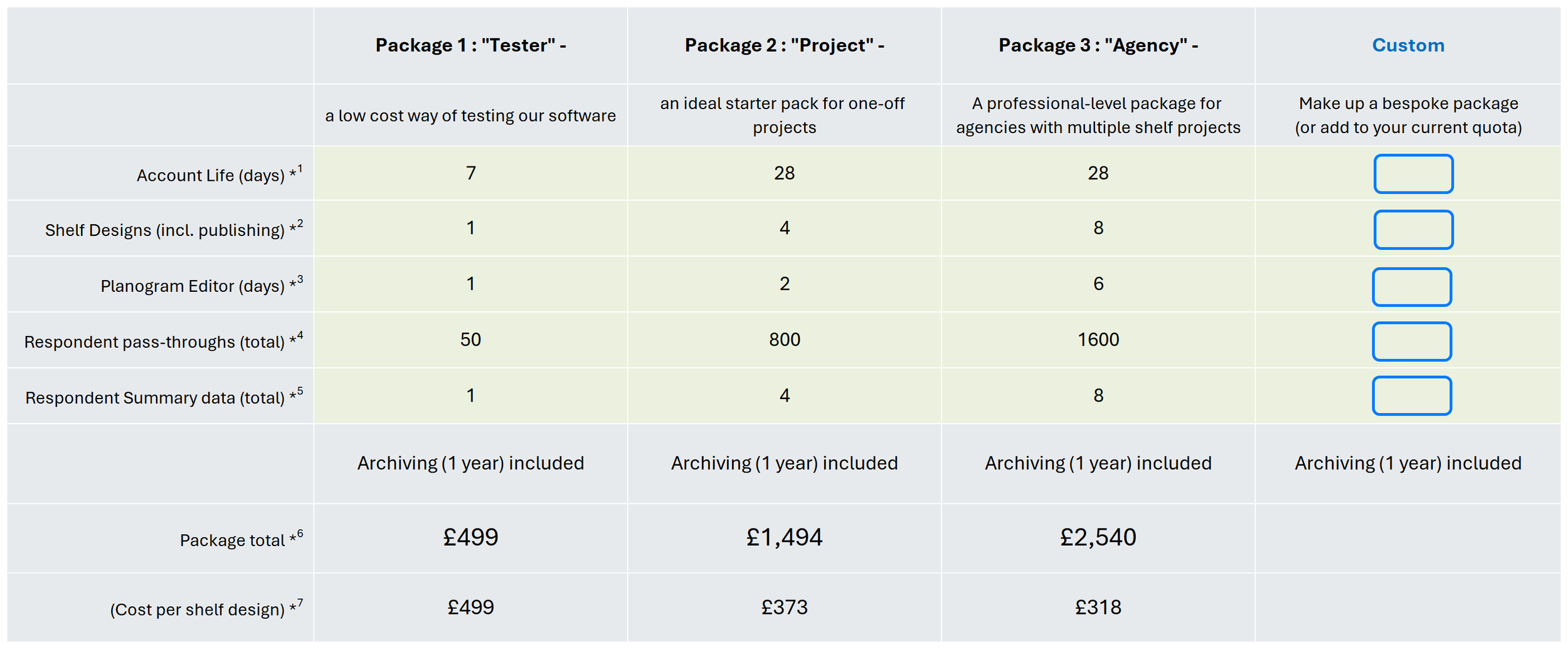 Project - £1,494 (4 interactive shelves, 28-day account life, 2 editor days, up to 800 respondent pass-throughs)